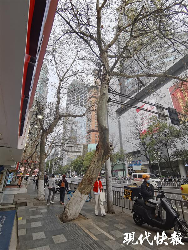 市民反映的这棵梧桐树位于秦淮区石鼓路南侧的人行道上,在大洋百货对面,紧挨着一座6层居民楼,一楼是餐饮店铺,往来行人较多。3月29日,现代快报记者在现场看到,这棵梧桐树躯干直径半米多,从地面往上一层楼高的树干部分呈倾斜状态,与地面的夹角在45度到60度之间。再向上生长,树干又恢复了垂直向上,至三层楼高处有众多枝丫,组成了巨大的树冠。