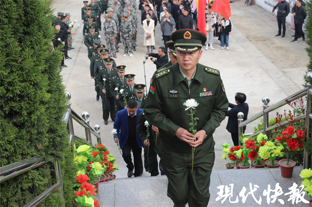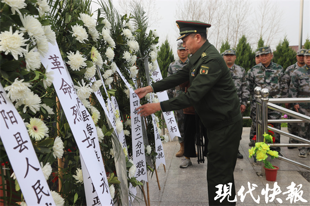3月30日上午,盐城市射阳县海河革命烈士陵园内,中部战区某红军旅官兵代表和射阳县人武部官兵及各界人士300多人,在烈士墓前,向79年前在这里英勇牺牲的先烈敬献花篮并行军礼。现代快报记者了解到,至此,烈士陵园内19位无名烈士的英魂,79年后全部“归队”。