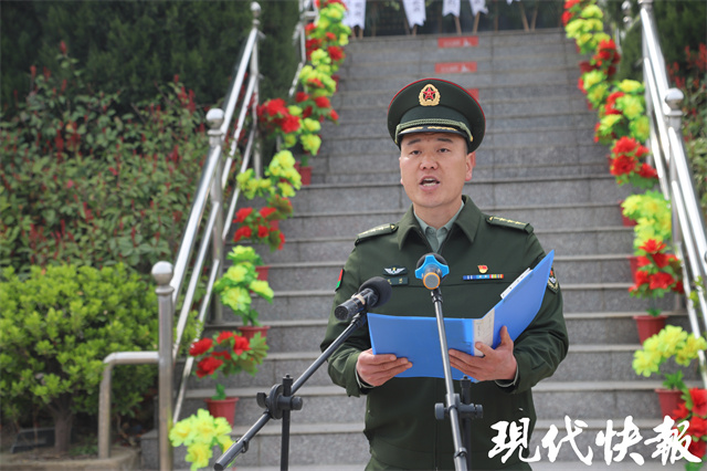 △原十八烈士所在部队“英勇冲杀连”第36任政治指导员张斌在烈士墓前致辞