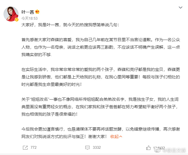 3月31日晚,叶一茜发长文回应网上争议,为自己几年前在节目里的不当言论道歉,同时表明自己非常爱两个孩子,森碟和亮仔都是宝贝,并没有重男轻女,关于“姐姐改名”的事情也不像网络所传。