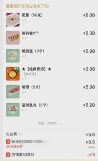 据报道,在某麻辣烫店选择汤底之后,包装费就变成了3元,而在添加了一份肥肠后,包装费便上涨了1块钱,包装费用又增加了0.4元。点了5个配菜,包装费便涨到5.6元,结算时,实付款18元的一单外卖,仅包装费便占了总价格的30%以上。而最终,这些配菜大多盛放在一个塑料袋包着的包装盒内。