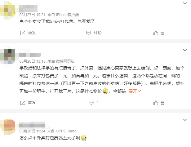 据工人日报报道,3月29日,辽宁沈阳消费者张女士反映,她当天通过外卖平台在某热销奶茶店总店买了一杯奶茶,发现被商家收取了打包费。“一份13、14元的奶茶,打包费竟要4元,而且送来后那杯奶茶外面就只有一个塑料袋。”针对张女士提出不该收取这么多包装费的问题,奶茶店工作人员解释说:“你也看到了,我们有5元店铺立减券,平台还要抽取一部分佣金,不收打包费就亏了。”3月29日,上海电视台《新闻透视》栏目也报道了一个“18块的麻辣烫外卖,包装要6块”的案例。