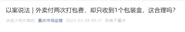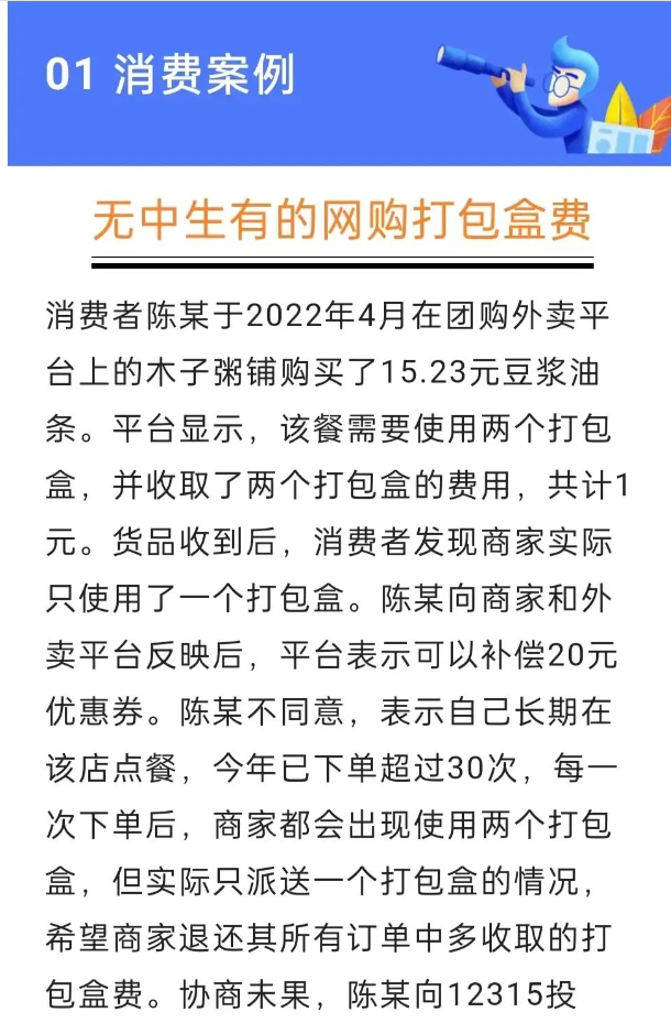 3月28日,重庆市市场监督管理局发布了一个案例。案例中,消费者交了两个打包盒的费用,却只收到一个。