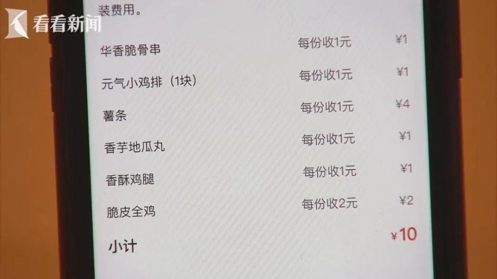 “一起打包的,你不能按单个来算的。如果按单个来算,这个价钱就非常夸张。一串炸串才多少钱,到时候收一份打包费,这个占比就不符合这个道理嘛。这影响消费者合法的利益,反正最终就是消费者买单嘛。”