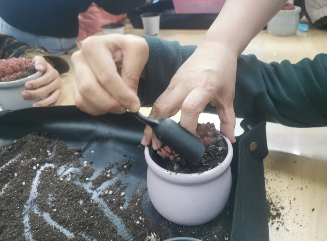 李文陪儿子乐乐在职康站种多肉植物。澎湃新闻记者刘璐摄