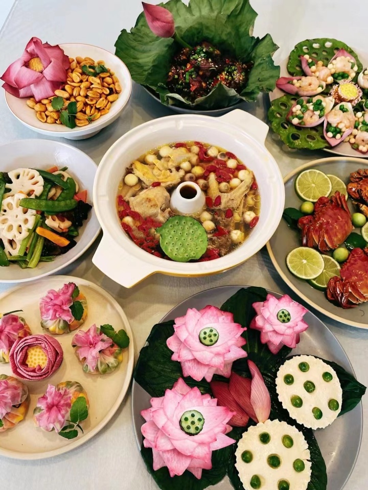 “未觉”的家宴并没有用太贵的食材,基本上每桌制作的成本在200元左右,但在造型上融入了很多的巧思,“比如说我做荷塘月色时要去采购大小适中的荷叶,莲花的花瓣是用白萝卜雕刻而成的,刻好之后再用新鲜的火龙果汁点染上去,都花费了很大的功夫,虽然采购成本不高,但关键是投入的人工成本,既然要做我就想做到最好。”