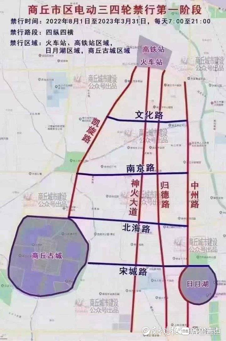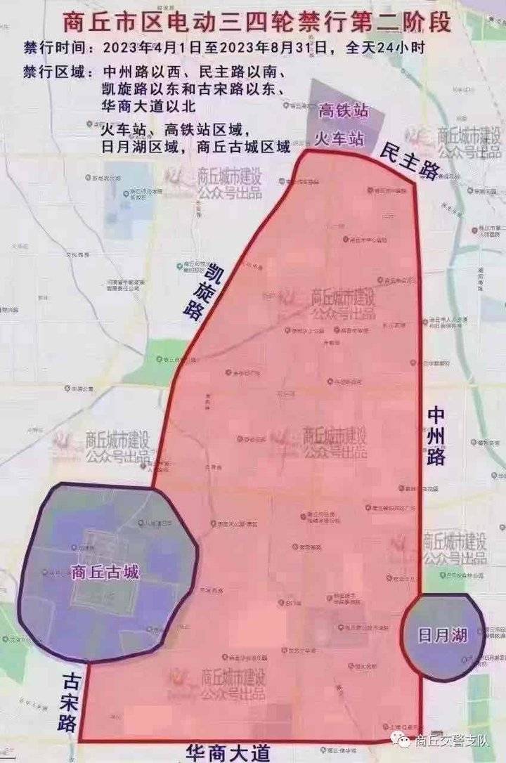 2022年7月11日,商丘市公安局、市市场监管局、市工信局、市城管局以及市交通运输局五个部门联合发布《关于在商丘市开展电动(燃油)三轮车电动四轮车规范管理的通告》(以下简称《通告》),规定禁止生产、销售违规的电动(燃油)三轮车、电动四轮车,禁止拼装和非法改装这两类车型,禁止这两类车型违规从事经营性载客或货物运输。