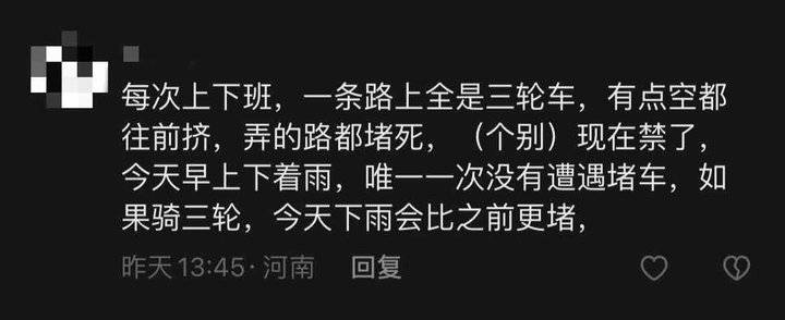 另有一位网友说,“每次上下班,一条路上全是三轮车,有点空都往前挤,路都堵死了。现在禁了,今天早上下着雨,如果有三轮车,会比之前更堵。”
