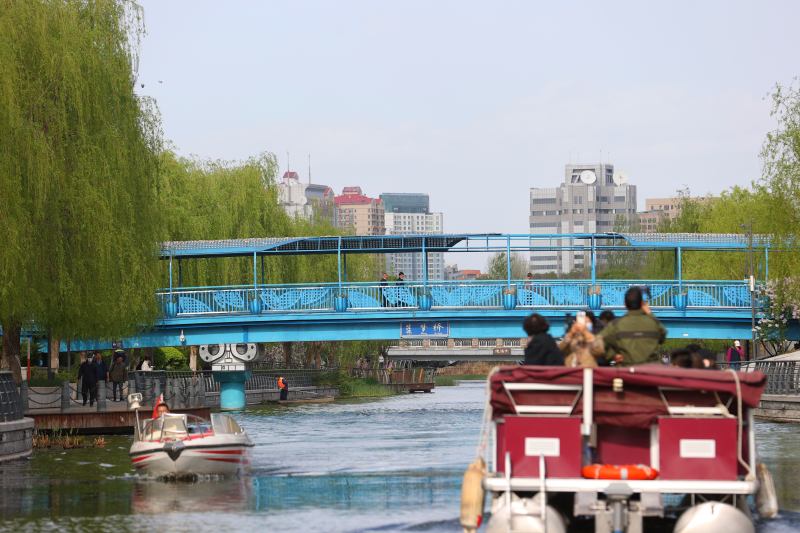 亮马河最出圈的当属乘船夜游,但白天的亮马河游船同样别具一番风韵。4月6日下午,记者乘船从燕莎码头出发,与夜晚灯光璀璨的亮马河相比,春日阳光下的亮马河充满着五彩缤纷的颜色。河道绿波轻涌,沿河两岸绿草茵茵,樱花、海棠花、桃花竞相绽放。河面上,不时看到有水面“美容师”拿着工具清理水草,清洁的水面不仅让亮马河增添了风采,更确保了游船能够安全、顺利地通行。特别值得一提的是,夜晚乘船游览亮马河时,各座桥上都装点着灯饰,与河道交相辉映,而白天游览亮马河,桥身便可清晰地展现在游客眼前。蓝色的“蓝梦桥”、色彩斑斓的“彩虹桥”、橙色的“日升桥”……亮马河24座桥各具特色。