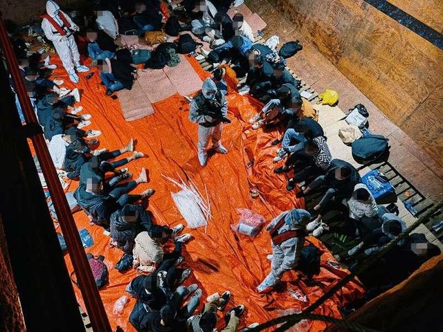当天18时左右,抓捕警力对停泊在防城港市企沙海域的货船进行突袭,对各船舱进行详细检查,在昏暗的底部船舱内,民警发现席地而卧的嫌疑人79名。