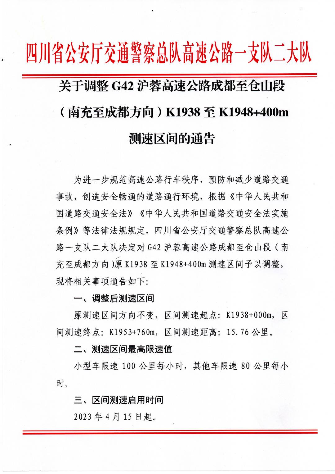4月8日,封面新闻记者从四川省公安厅交警总队高速公路一支队二大队获悉,4月15日起,G42沪蓉高速公路成都至仓山段(南充至成都方向)K1938至K1948+400m测速区间将予以调整。