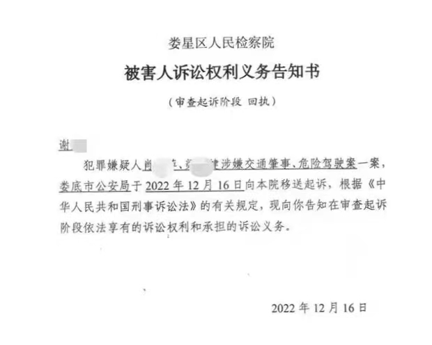 海报新闻记者在周先生提供的“娄星区人民检察院被害人诉讼权利义务告知书”中看到,犯罪嫌疑人肖某某、梁某某涉嫌交通肇事、危险驾驶一案,娄底市公安局于2022年12月16日向该院移交起诉。