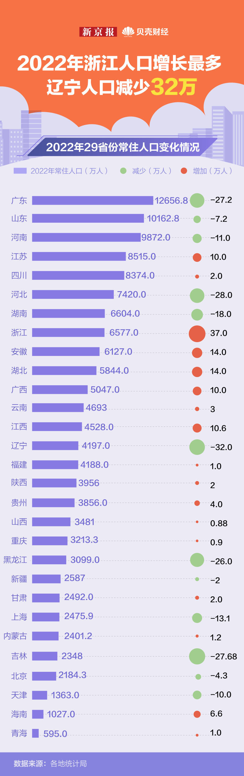 2021年人口增量全国第一的湖北,2022年也陷入增长困境。2022年湖北人口增长14万人,人口增量不及浙江,与安徽并列全国第二。但值得注意的是,湖北人口增量锐减的背后与生育情况有很大关系,2022年湖北自然增长为-2.01‰,出生人口35.5万人,而死亡人口达47.2万人。