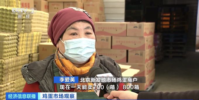 北京新发地市场鸡蛋商户李爱英:现在一天能卖700箱、800箱,比2月份一天多卖200箱、300箱。价格最高的时候到5.1元、5.2元一斤。