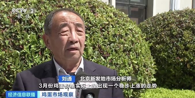 北京新发地市场分析师刘通:3月份鸡蛋价格出现稳步上涨的走势,3月初新发地市场鸡蛋批发的平均价格是9.23元一公斤,到了3月下旬上涨到10.48元一公斤,涨幅相对比较明显。