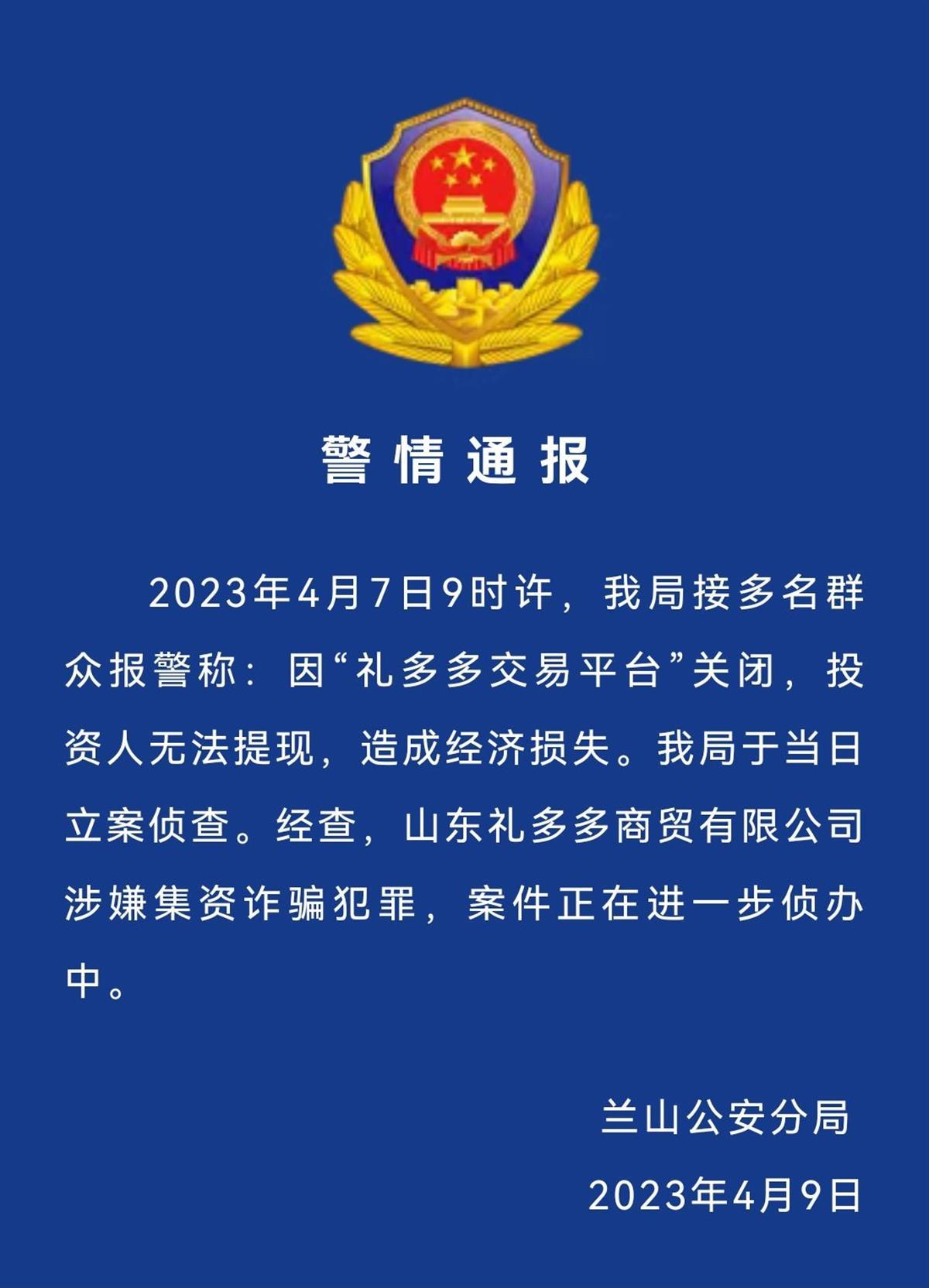 4月9日上午,临沂市公安局兰山分局发布警情通报称,2023年4月7日9时许,接多名群众报警称:因“礼多多交易平台”关闭,投资人无法提现,造成经济损失。兰山公安分局于当日立案侦查。经查,山东礼多多商贸有限公司涉嫌集资诈骗犯罪,案件正在进一步侦办中。