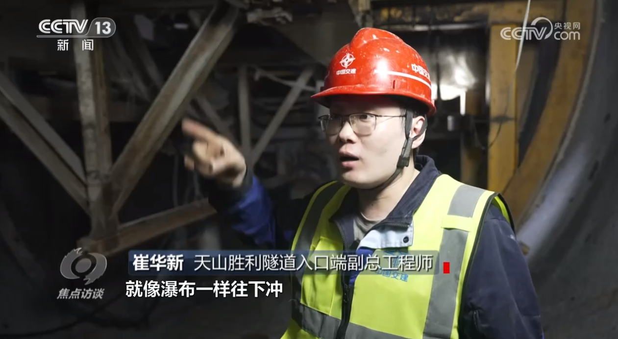 天山胜利隧道出口端项目经理李亚隆:“修隧道最怕的一个是涌水,第二个是围岩破碎。这个隧道应该说是‘地质博物馆’,各种不良地质、各种断层破碎带,以及涌水、岩爆都在这个项目上遇到过。”