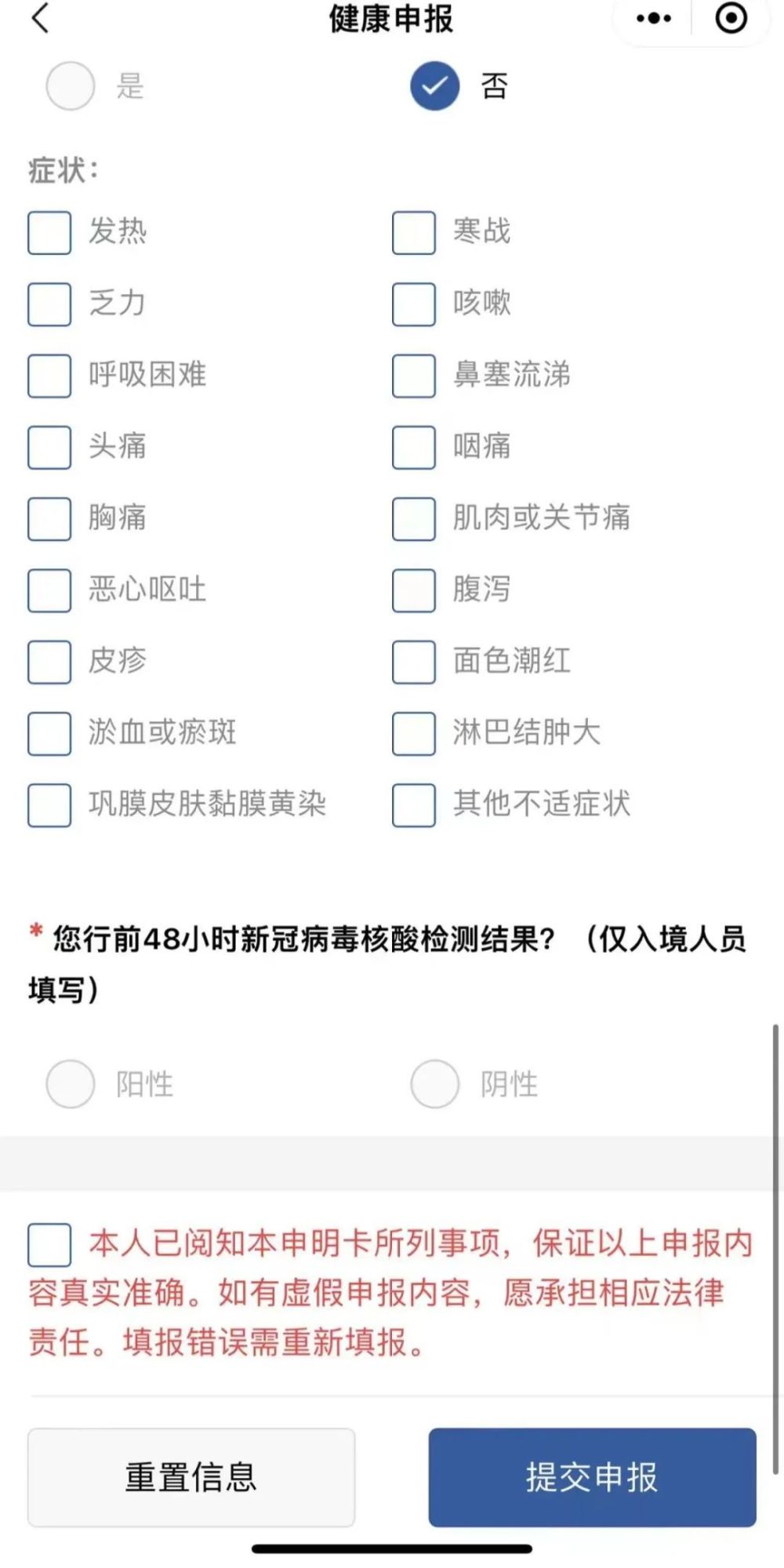 为此,张先生在落地香港后,花费499港元做了一次核酸检测,拿到阴性报告后即入关深圳。然而,到了深圳并没有人要求他出示核酸检测报告,海关所要求他填写的《中华人民共和国出/入境健康申明卡》,也没有上传核酸检测报告的要求,只需要自觉填写“行前48小时新冠病毒核酸检测结果是阴性还是阳性”。