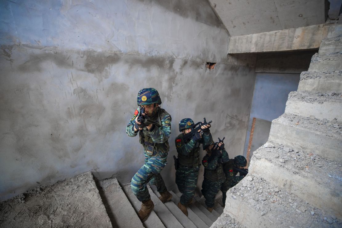 “‘暴恐分子’全部藏匿于二楼。”复盘结束后,在确定“人质”安全的情况下,指挥员结合现场态势,抓住战机,果断下令,各组协同配合,成功将“暴恐分子”捕歼。
