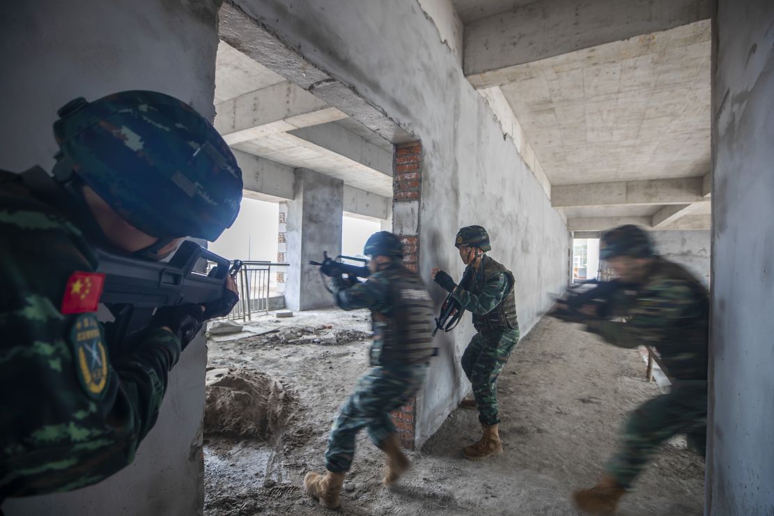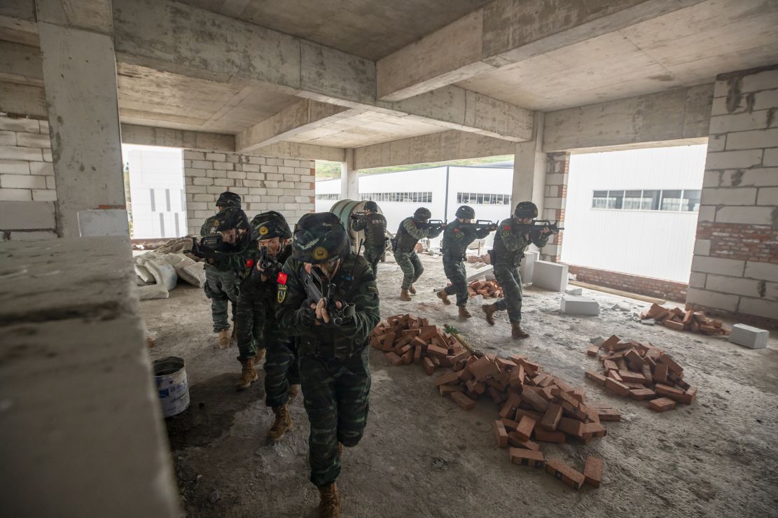 近日,在武警重庆总队执勤第三支队楼房反劫持演练现场,特战官兵持枪突入房屋,犹如神兵天降,精准高效解救人质,抓捕“暴恐分子”,在实战环境下,锤炼打赢制胜的实战本领。
