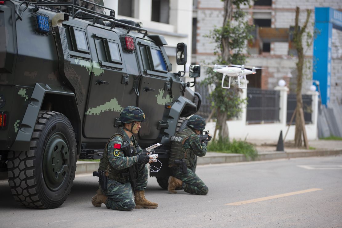 到达现场后,侦察队员利用无人机对‘暴恐分子’藏匿的楼房周围情况进行侦查,狙击组迅速占领制高点,突击组隐蔽接近。