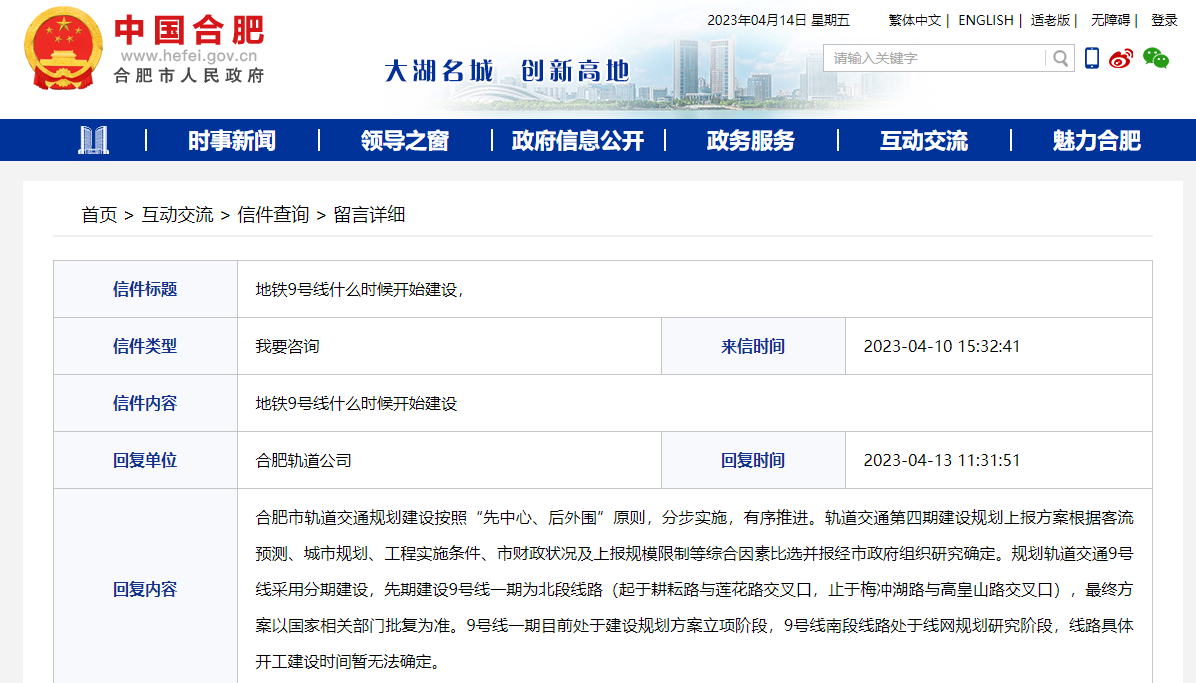 大皖新闻讯近日,有网友在合肥“12345政务服务便民热线直通车”留言,咨询地铁9号线何时开始建设。