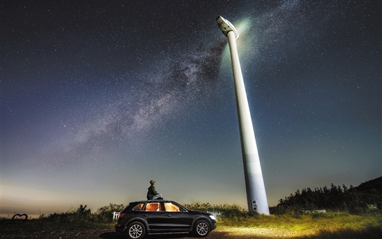 单一栋作品《星空下的风电机》,摄于东阳东白山。