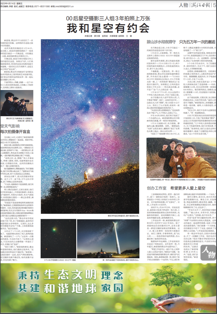 单一栋去年毕业后,回绍兴老家创业,开了一间摄影工作室。他在电话中告诉记者:“现在不像在学校里时间多,但是我还会继续拍星空,不会因为毕业就放弃自己热爱的东西。”这番话也说出了麻恩瑞和蔡志洋的心声。“追星,我们会坚持到底。”麻恩瑞说。
