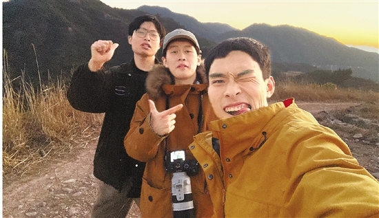 完成野外拍摄后,单一栋(后)、蔡志洋(中)和麻恩瑞(前)三人合影。 (本版图片均由受访者提供)