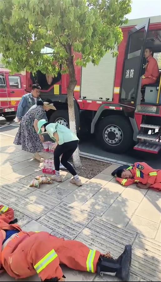 玉溪市红塔区居民王先生称,14日下午1时许他和朋友到当地大湾山附近一座山头,发现不远处的大湾山上长达数里烟雾弥漫,山风呼呼作响,有救援人员和车辆在忙碌。在红塔区科教园区附近路边,王先生专门给在这里临时休整的消防救援人员送去矿泉水、面包等物资,看到有的救援人员累得席地而卧,远处的高山上烟雾弥漫。