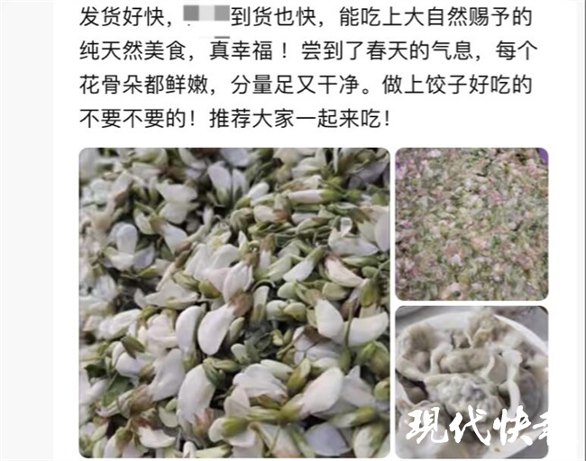 除了线下,现代快报记者在电商平台中搜索“可食用花”,可以看到槐花、玫瑰花是其中销售量较多的品种。其中一家店铺槐花的销量超过了3000件,有网友评价“尝到了春天的气息”“做成饺子很美味”,还有网友晒出自己做的槐花鸡蛋饼。