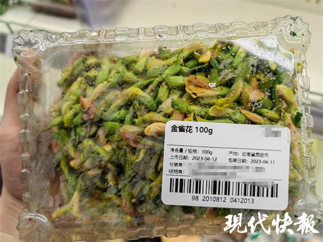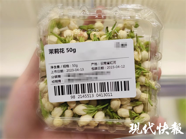 相比街头常见的槐花,9.9元一两的茉莉花,8元一两的玫瑰花,13元一两的金雀花,价格相对更高一些。在某连锁商超,它们从云南包装好后空运而来,放在保鲜货架,看起来仍然娇嫩。
