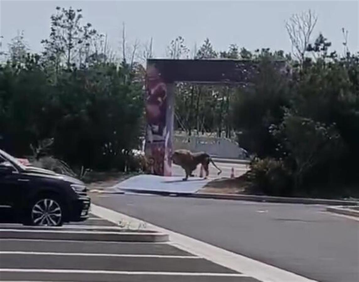 视频显示,一只狮子在一处停车场附近行走。另一段视频中,众多游客四散跑开,路边一处展板上写有“巅峰大马戏”字样。