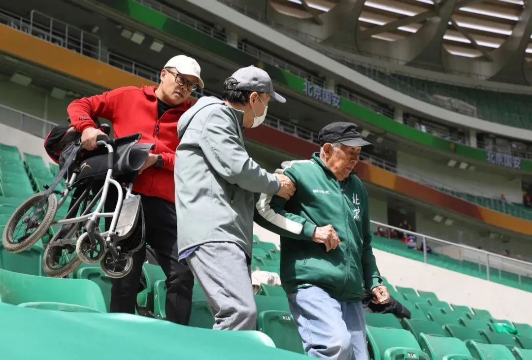 ↑4月11日,88岁的老球迷倪松年(图右)来看竣工后的“新工体”。