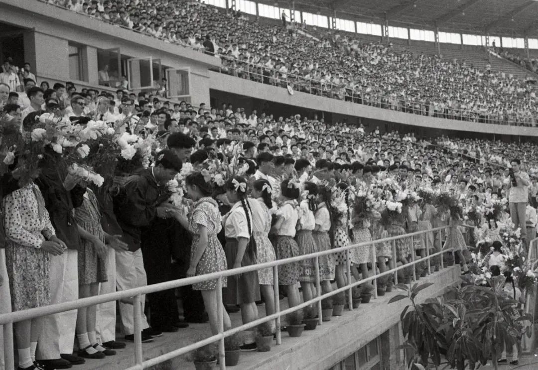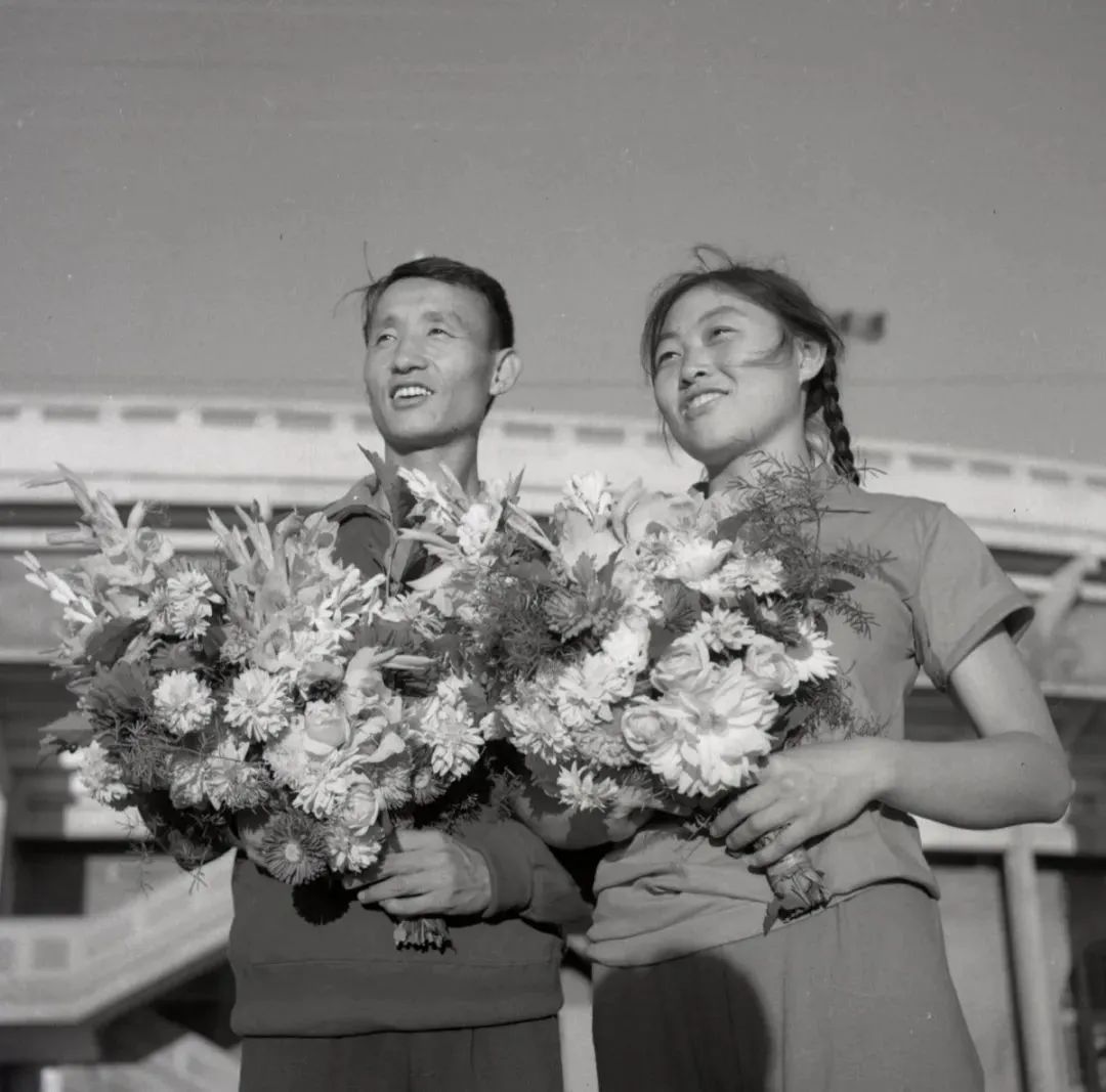 ↑1959年9月,第一届全国运动会在京举行,两名获奖运动员在工人体育场合影。工人日报—中工网记者蔡壮田摄