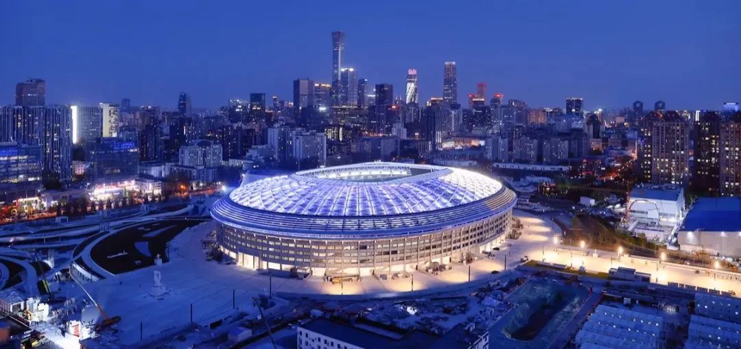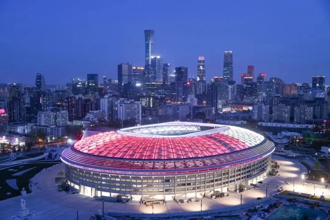 ↑4月8日,北京新工人体育场进行亮灯测试,为正式投入使用做准备。