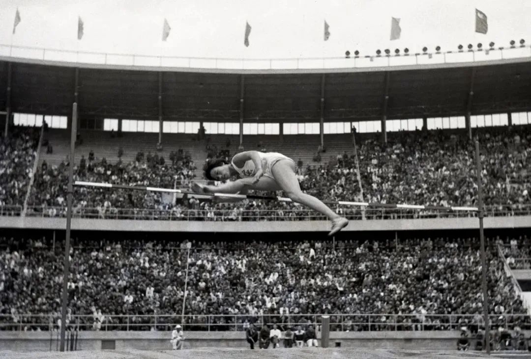 ↑1959年9月20日,在第一届全国运动会上女子跳高决赛中,山东选手郑凤荣以1.70米的成绩取得第一名。工人日报—中工网记者王光禄摄
