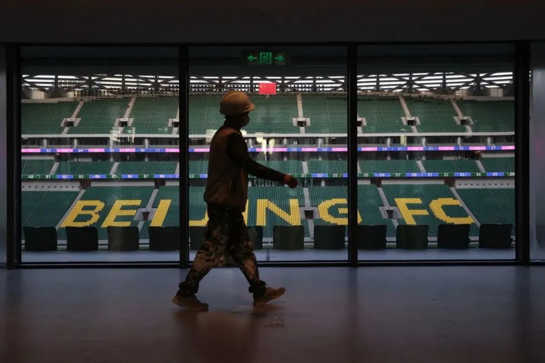 ↑4月11日,“新工体”为中超揭幕战做最后的准备,一名油漆工从西侧大厅走过。