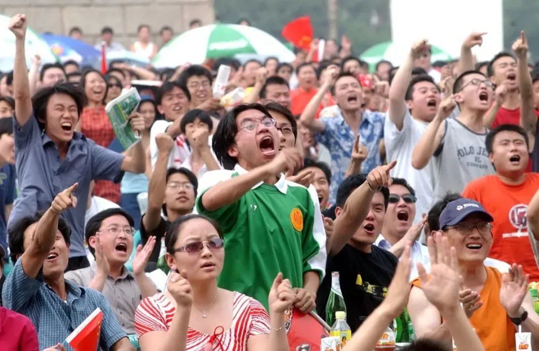 ↑2002年6月4日,中国队第一次打入世界杯,在工体的外场球迷们观看中国队在世界杯的比赛。工人日报—中工网记者许之丰摄
