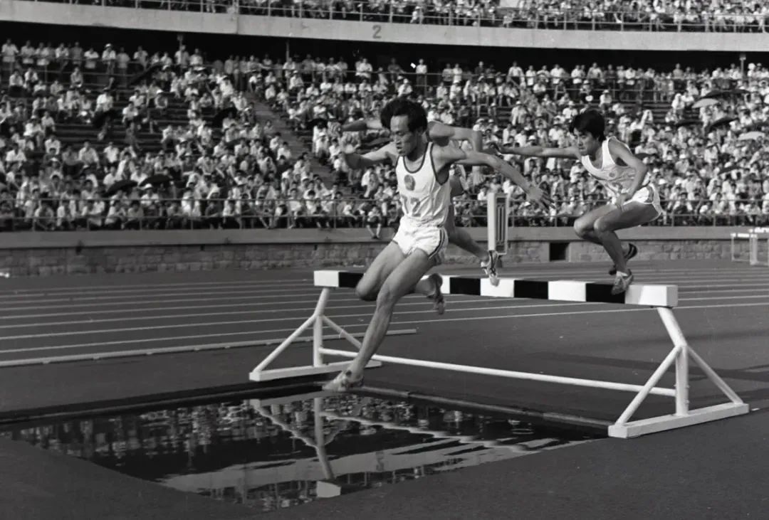 ↑1979年7月1日,工人体育场。中日两国运动员在第四届中日田径对抗赛中进行3000米障碍比赛。工人日报—中工网记者安晓远摄