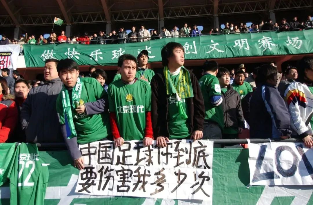 ↑2004年10月4日,首届中超联赛最后一轮比赛打响。球迷们在工体举行的比赛现场,用横幅表达对中国足球的不满。工人日报—中工网记者许之丰摄