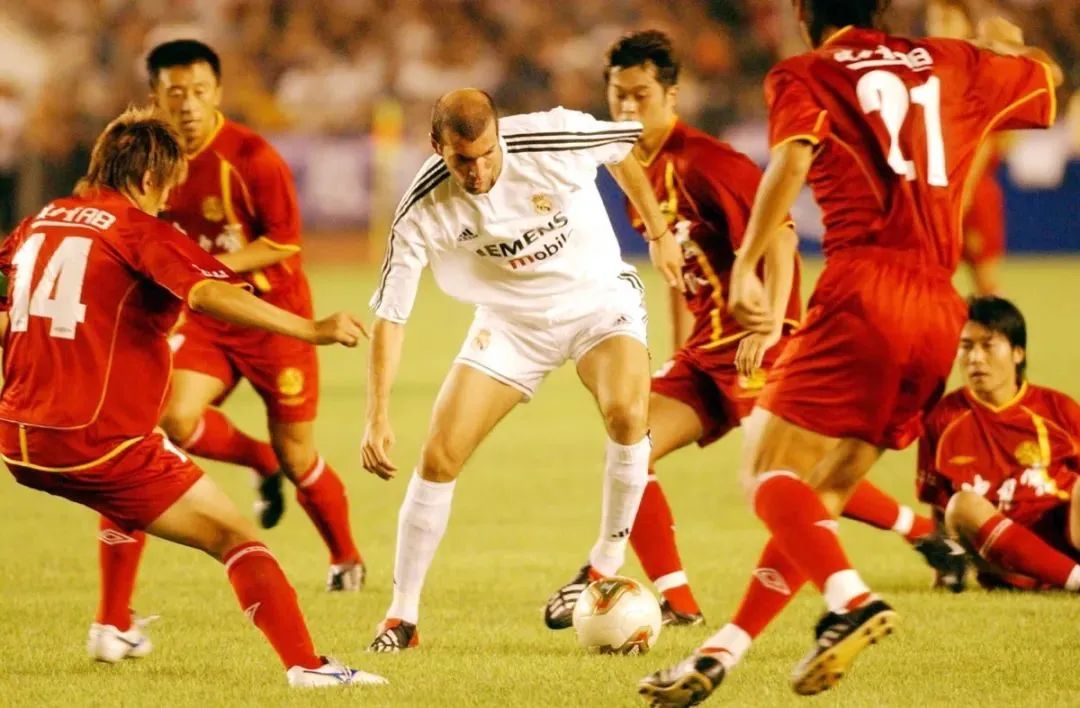 ↑2003年8月2日,由四家中国足球俱乐部球员组成的“中国龙队”在工体迎战西班牙皇家马德里足球队,此战被称为“龙马大战”。图为曾当选“世界足球先生”的法国球星齐达内在五名中国球员的夹击下从容控球。工人日报—中工网记者许之丰摄