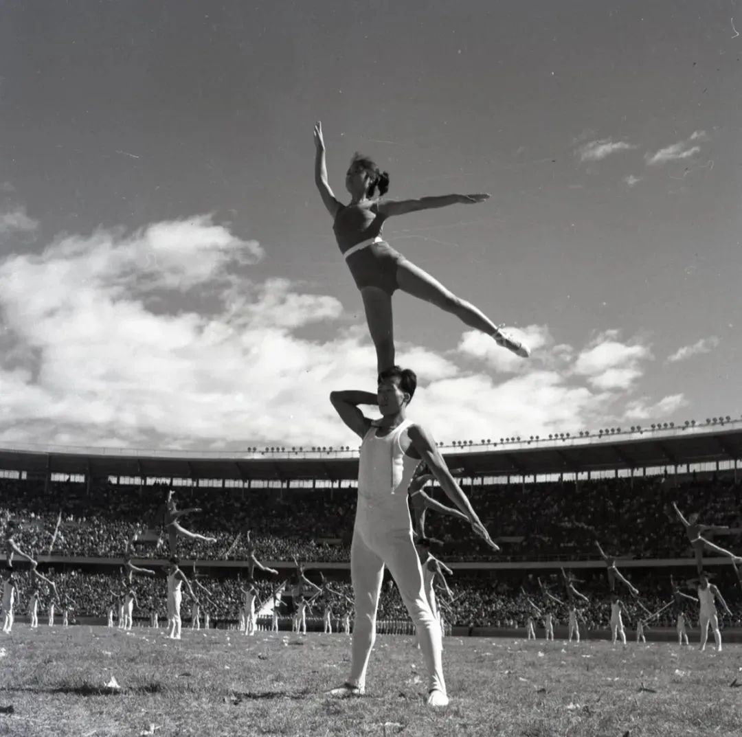↑1959年9月,北京。在第一届全国运动会上,首都学生进行团体操表演——“青春的花朵”单腿站立平衡动作。工人日报—中工网记者吴启华摄