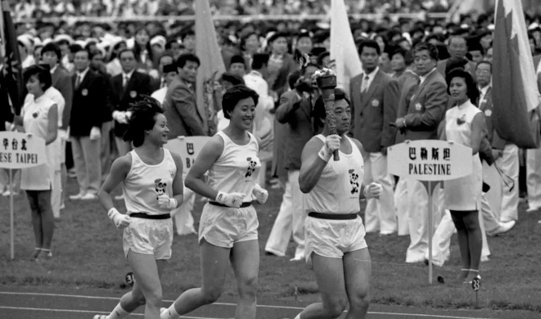 ↑1990年9月22日,北京工人体育场,第十一届亚运会开幕式,火炬手许海峰、张蓉芳、高敏(前排从右至左)跑入会场。工人日报—中工网记者蔡金和摄