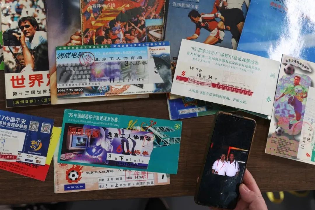 ↑4月8日,北京资深球迷文克俭展示他的部分收藏,其中有1995年、1996年的球票,以及手机里珍藏的和“白贝利”济科的合影。