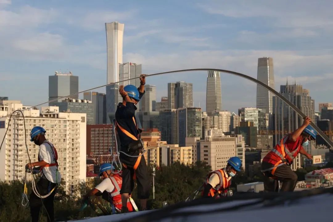 ↑2022年7月18日傍晚,在北京工人体育场改造复建工程的顶棚上,工人们在太阳的余晖下作业。