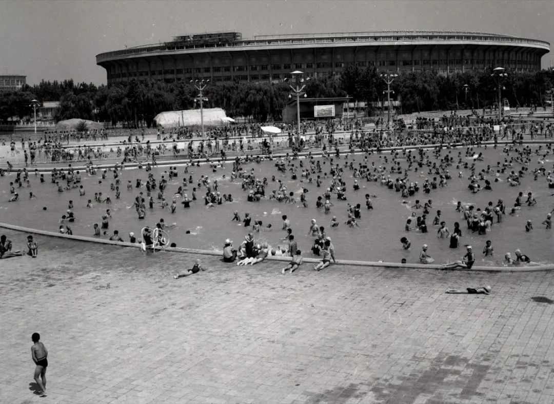↑1965年7月17日,北京工人体育场外的游泳场,职工们正在游泳。工人日报—中工网记者吴洛夫摄