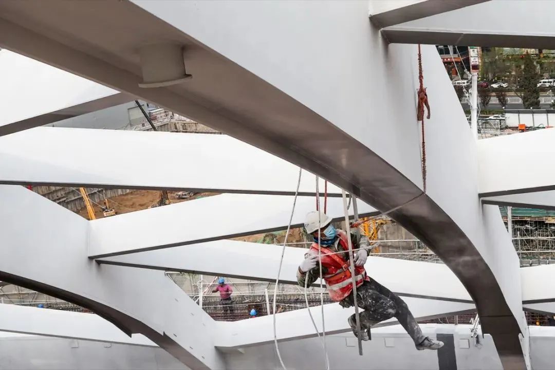 ↑2022年4月10日,北京工人体育场建设工地,一名油漆工在钢铁罩棚下悬空作业。