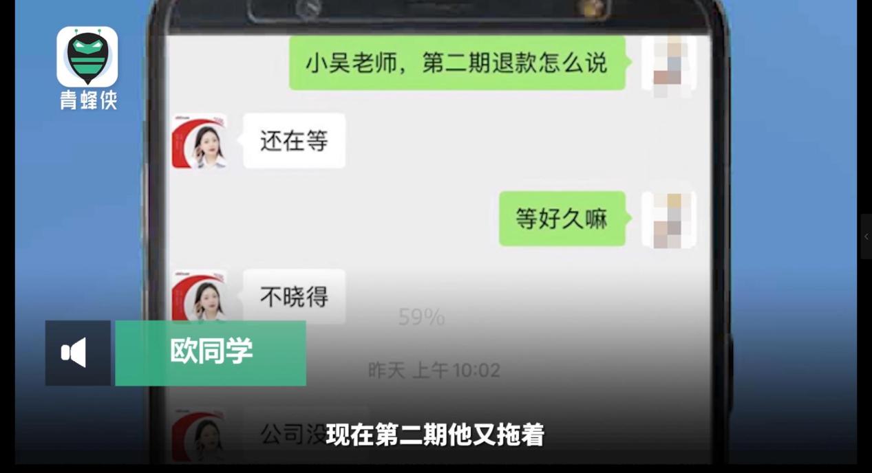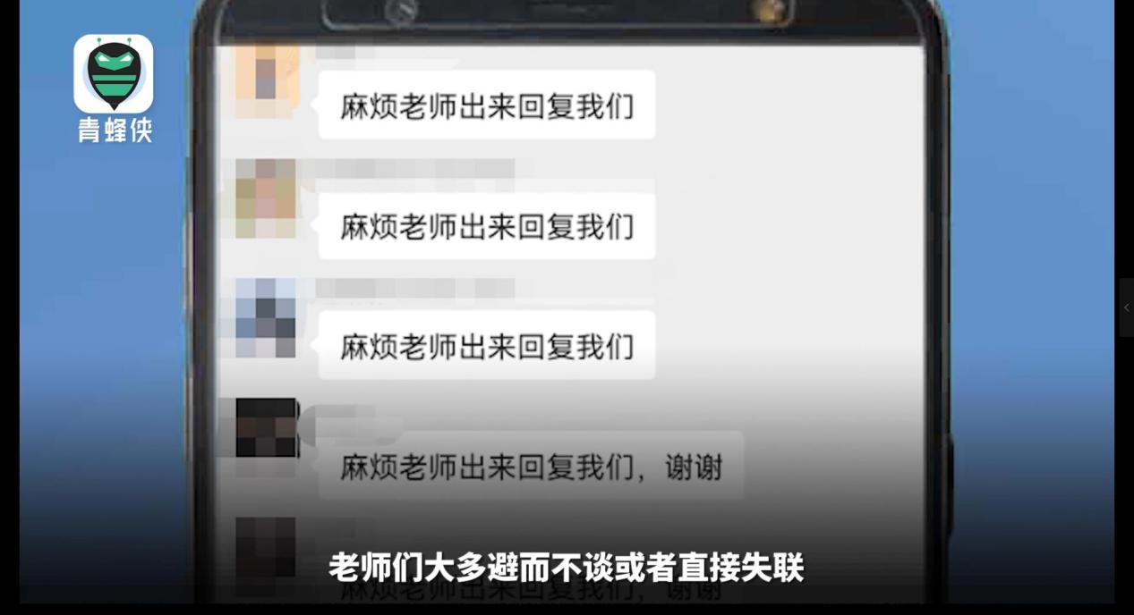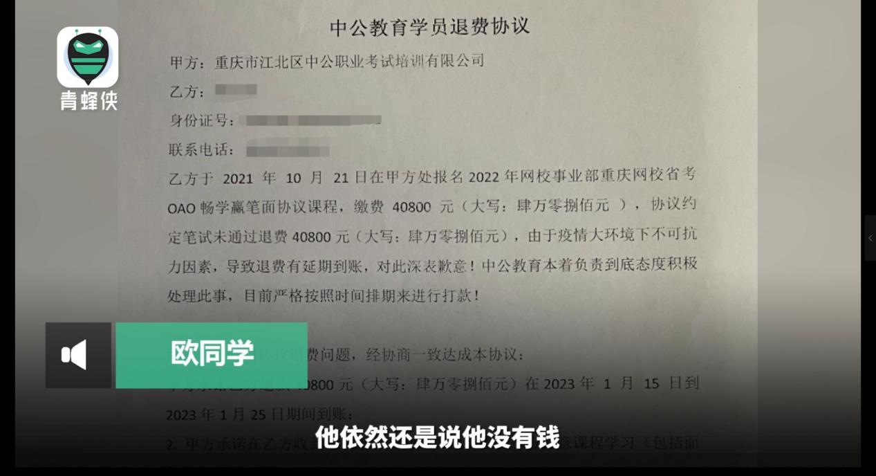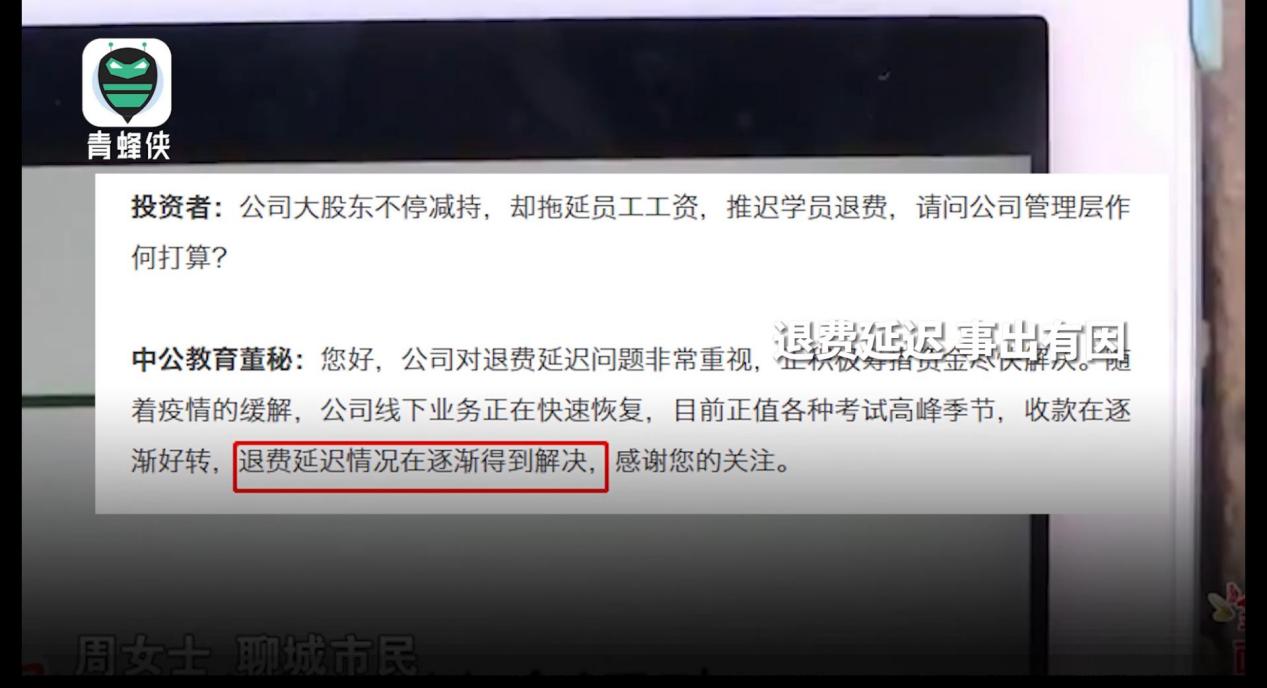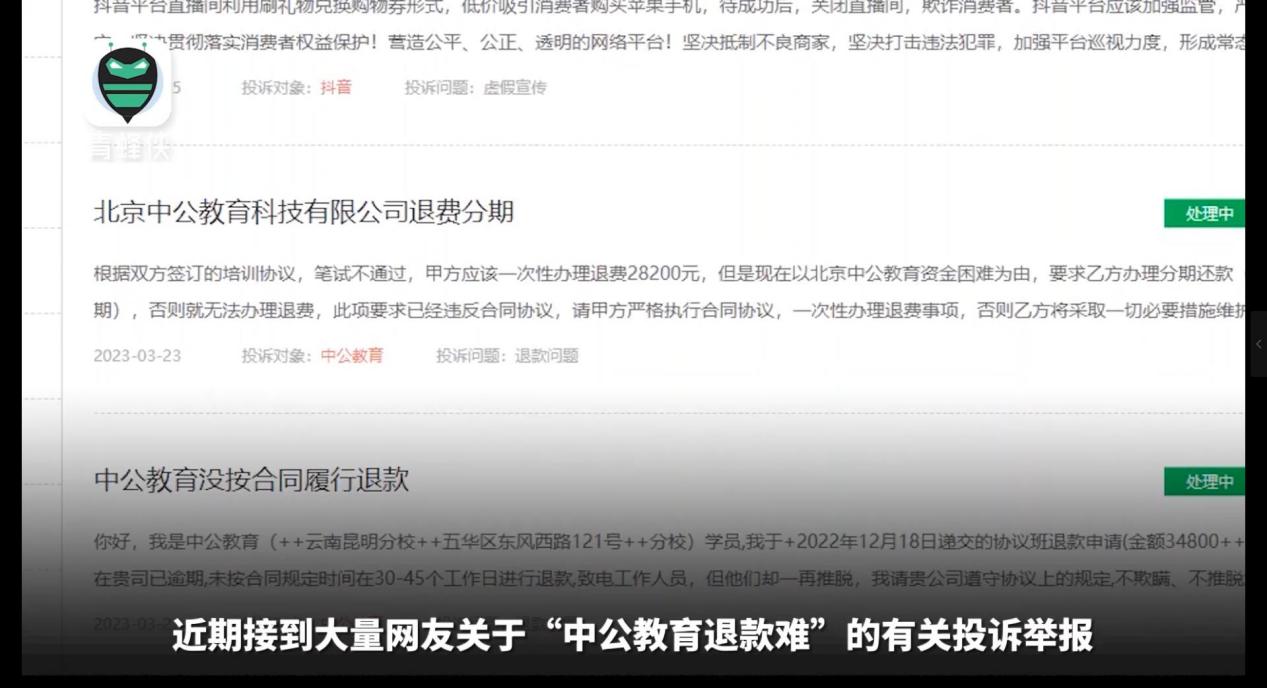 青蜂侠-青年守护平台上线后近期接到大量网友关于“中公教育退款难”的有关投诉举报。视频截图