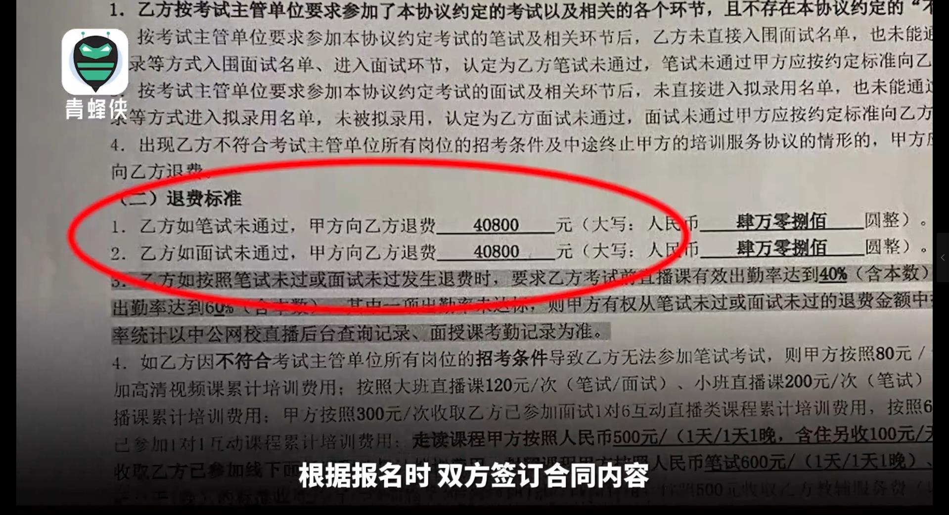 中公教育与学员签订合同中明确写明“若笔试、面试未通过,退还全额费用”。视频截图